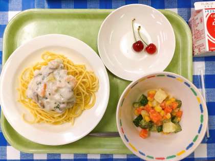今日は聖火リレー給食で、山形県にちなんだ給食です。山形県は、さくらんぼの産地として有名です。その生産量は、全国1位をほこっています。今日の給食のさくらんぼも、山形県から届きました。さくらんぼは初夏の今が旬で、食べられる時期が短いので、味わって食べてください。