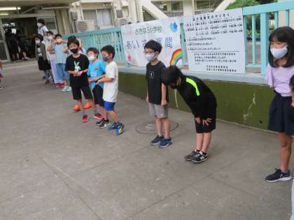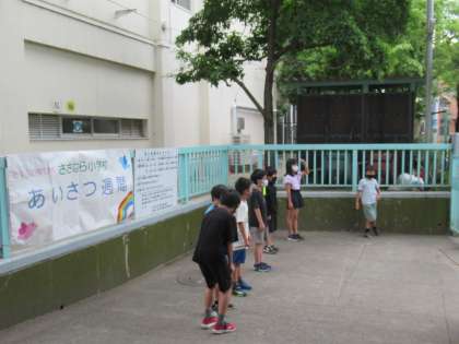 今日からはじまったあいさつ週間は4年生が担当です。いつもより早く朝の準備をし終え、正門前で「おはようございます。」と、げんきなあいさつをしていました。今日もステキなあいさつから学校生活が始まりました。