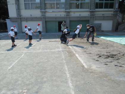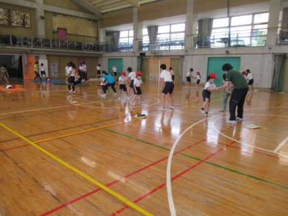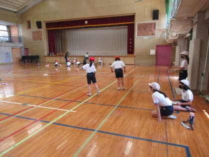 校庭では、立ち幅跳び・ソフトボール投げの2種目を、体育館では、反復横跳び・上体起こし・長座体前屈の3種目を、時間を割り振り一斉に計測しています。(4・5・6年生は、今日は、立ち幅跳びとソフトボール投げの2種目を行っています。)なお、残りの種目については、学年・学級の時間を使って行うことになっています。