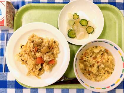 キムチチャーハンは、今年度初めて給食に出る人気メニューです。キムチのほかにお肉や野菜が入っていて、食べると元気が出てきます。辛いものが苦手な人も食べやすいように作っているので、ぜひ食べてみてくださいね。