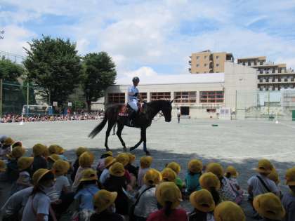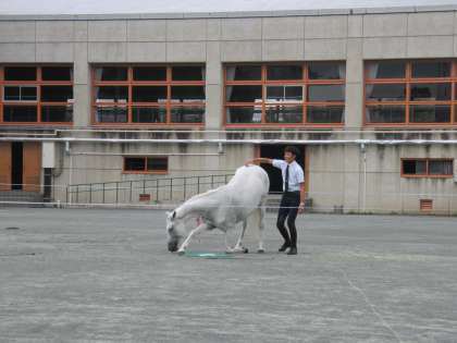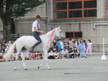 続いて校庭に出て、競走馬のネコパンチくんによる3種の歩様披露、演技する馬のネレイダちゃん(南フランス生まれ)によるホースショーを鑑賞しました。