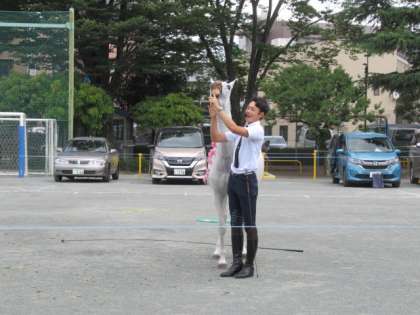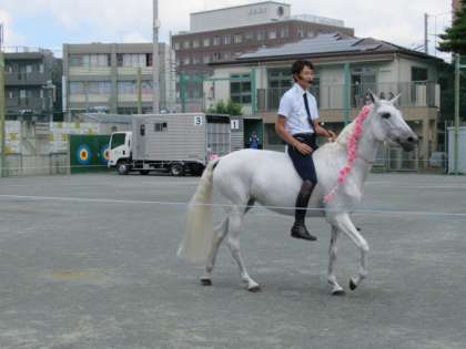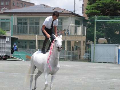 フランスから日本に来た白い馬の登場に、子どもたちの視線が集まりました。指導者と一体となったすてきな演技とあいさつ、馬術につながるような動きに感動しました。