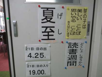次に、今週のキーワードとして、今日6月21日(月)がちょうど二十四節気の「夏至」にあたることと、夏至の意味や東京の今日の日の出の時刻(4時25分)と日の入りの時刻(19時00分)、最も長くなる昼の時間、昼の時間と夜の時間の比較などについて説明しました。