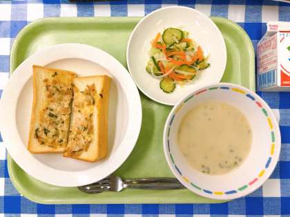 ツナマヨトーストは、ツナ、マヨネーズ、細かくきざんだきゅうりとたまねぎを混ぜ合わせてつくります。それを一枚一枚、調理員さんが心を込めて塗っています。約530枚分を塗っているので、何時間も立ちっぱなしですが、みなさんの「おいしい!」の笑顔のために頑張っています。