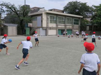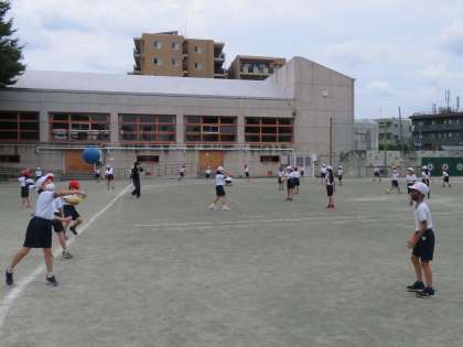 4年生の体育の学習では、球技を行っています。パスのみでいかに速くボールを運ぶかをチームで真剣に考えています。とにかく遠くまでパスをする方法を考えたり、階段状に並んでパスをしたり、友達の工夫を見て真似したりとチームで協力しながら取り組んでいます。