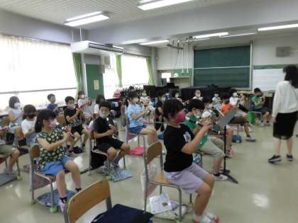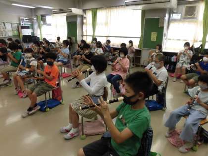 待ちに待ったリコーダーの学習が始まりました。感染リスクの関係からリコーダーの使用を控えていましたが、感染症対策を徹底しながら学習を始めます。リコーダーの持ち方や座り方、構え方などを教わりました。とても姿勢がよかったです。リコーダーの口のところにはめるキャップが配られ名前を書きました。今日は「シ」の音をだす練習をしました。これから上手になって、いろいろな曲が演奏できるようになることでしょう。とても楽しみです。
