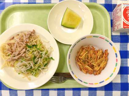 梅雨ですが、今日は真夏日のような天気ですね。そこで給食では。「冷やし中華始めました!」