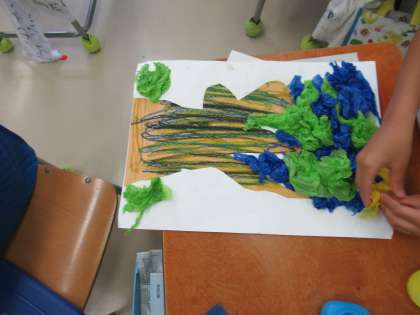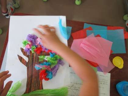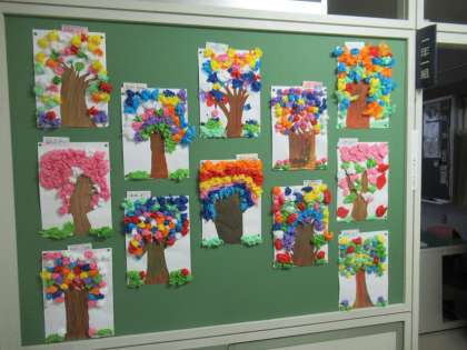 クレパスで木の幹を描き、切り取って台紙に貼ります。そこに、いろいろな色のお花紙をくしゃくしゃにしたり、重ねてみたりしてのりで貼り付け、花を表現しました。子どもたちの個性が出て、とても素敵な作品になりました。