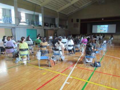 1年生保護者会では、最初に1学期を振り返っての様子を映像で紹介しました。また、各学年からは、配布資料をもとに子どもたちの成長の様子や今後への期待などについて話をさせていただきました。次に、夏休みの生活についても、学校からの一斉配布の資料でポイントとなる事柄を中心に説明させていただきました。
