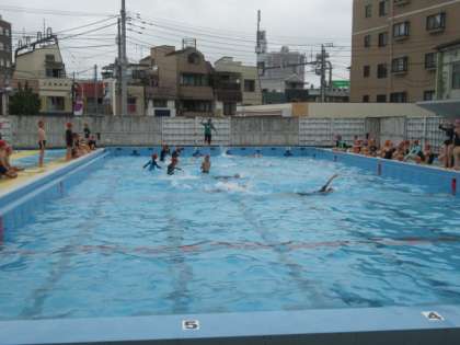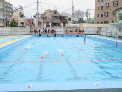 体育館で準備運動を行い、プールでの約束などを確認した後、プールサイドに移動しました。そして、シャワーを浴び、水慣れを行い、プールの横方向を使って泳いだり、最後にはプールの縦方向を使って25mをクロールや平泳ぎで泳ぎました。