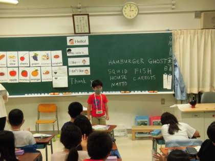 「I like swiming!」「I don't like baseball.」など、自分のことについてはきはきと話しました。互いに「がんばれ〜!」「よくできたじゃん!」と、発表を認め合う様子も見られました。