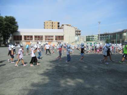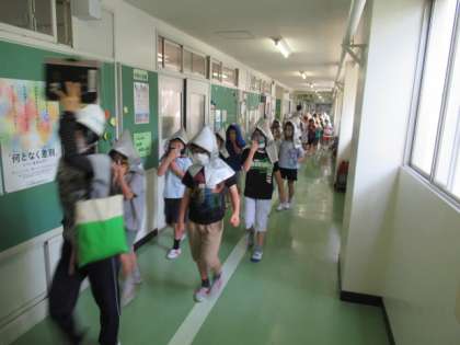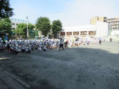 今回の想定は、近隣の住宅から火災が発生し、第1次避難場所の校庭に「お・か・し・も」の約束を意識して安全に避難することでした。