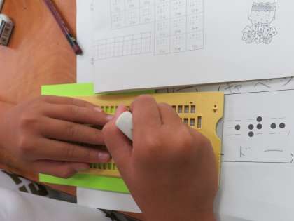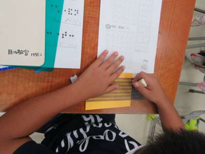 その後は、自分の名前や好きなものを、点字盤と点筆を使い点字で表していました。初めて自分で書いた点字の言葉を嬉しそうに何度も指でなぞっていました。
