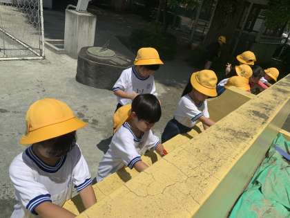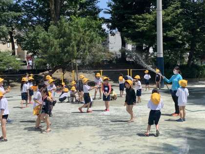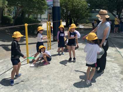 日陰で遊んだり、水分補給をしたりして熱中症に気を付けながら遊びました。時間としてはそれほど長くはありませんでしたが、子どもたちは大喜びでした。