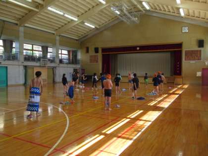 初回の部は6年生からスタートです。いつもの昇降口で受付を行い、更衣をして体育館で準備運動を行い、プールに移動して水泳の運動に取り組んでいます。