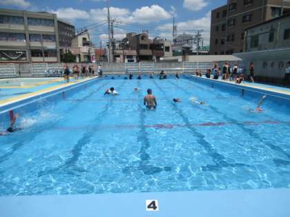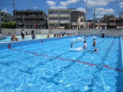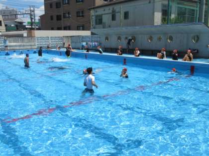 真夏の日ざしが射し込むプールで、プールの横方向を使って浮く・泳ぐ運動を行ったり、プールの縦方向25mを使ってバタ足やクロール、平泳ぎや補助具を使った泳ぎなどを存分に楽しみました。