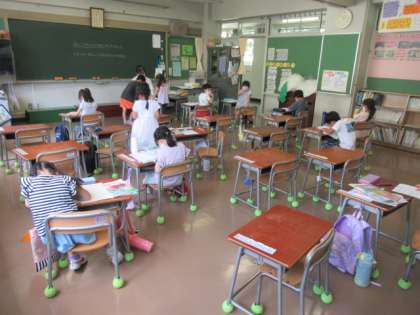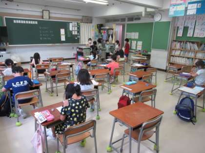 今日の学習教室の第2部では、1年生が自分の教室で、国語や算数の復習などの学習に、一生懸命取り組んでいました。
