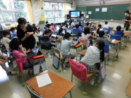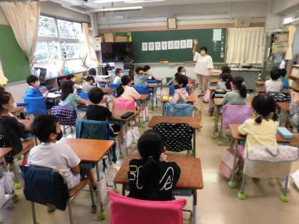 2学期2日目、外国語の学習がありました。ALTの先生とあいさつ、久しぶりなので少し緊張していましたが、だんだん元気な声が出てきました。気持ちや動きをジェスチャーで表し、どの言葉の動きか当てながら楽しみました。ZOOMの接続練習2回目は、昨日よりはやく接続できる子が増え、ミュートやカメラの切り替え方も習いました。明日からは、分散登校が始まります。