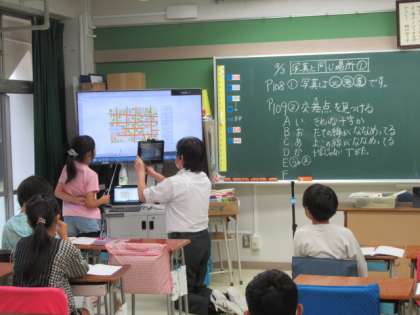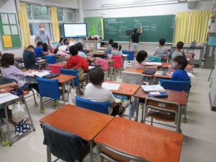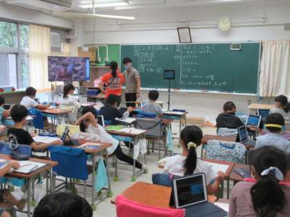 1学級の人数が最も多い3年生ですが、今日はAグループの友達と仲よく協力しながら生活しています。算数ではいつもの少人数学習ではなく、担当教員が自分たちの教室で授業を行い、2学級同時進行で学習を進めています。発表の際には、発表者が映像に映るように教室を移動して、みんなで発表を聴き合う場面もありました。