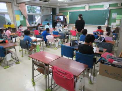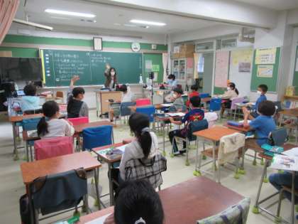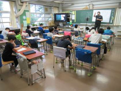 教科「日本語」・算数・理科などの学習をそれぞれの担任が受け持ち、午前中の学習が進められました。教室で発表する場面、オンラインを通して発表する場面など、場所は違ってもいつもの学年の友達と一緒に学ぶ体験をしています。
