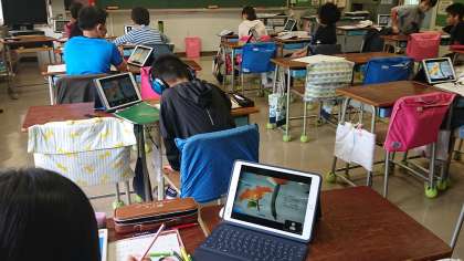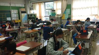 1組の授業を2組、3組、家庭でオンライン学習を通して取り組んでいます。
