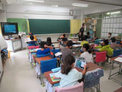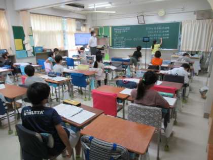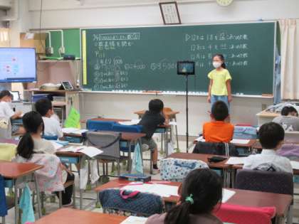 今日の1時間目の学習では、「10000より大きい数について考えよう」をめあてに、3年2組の教室からオンラインで映像を配信し、1組の教室と家庭を結んで、学年一斉で学習を進めていました。