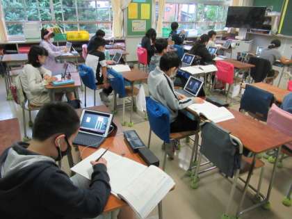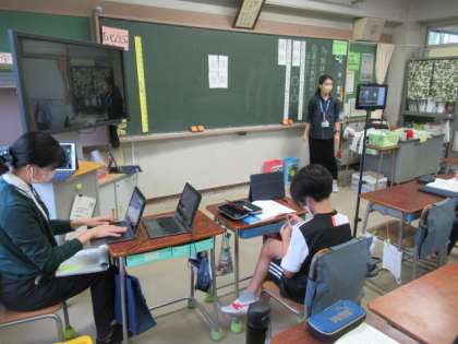 今回は、2組の担任が2組の子どもたちと学習を進め、撮影スタッフの教員がオンラインでの画像や音声のサポートをし、1組の教室とオンラインで学習する家庭へ配信していました。