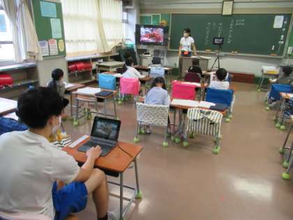 今回は、3組の担任が3組で授業を行い、撮影スタッフの教員がオンラインでの画像と音声を制作し、2組と1組の教室では各担任が送られてきたオンライン映像を活用して、同時並行で授業を進めました。