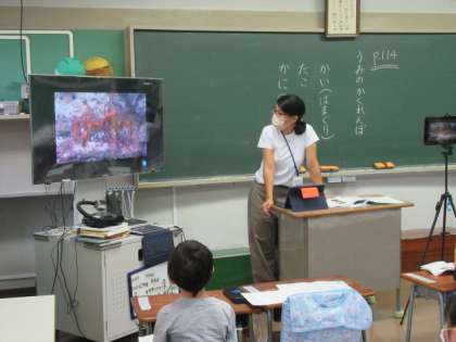 教科書の題名から内容を想像したり、海の生き物の動画を視聴して、それらの生き物について興味を膨らませたりし、学習への意欲を高めていました。