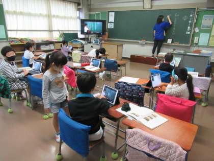 子どもたちは、大型テレビモニタの動画に大いに興味をもち、口々に感想を語っていました。これからの国語の学習が楽しみな子どもたちです。