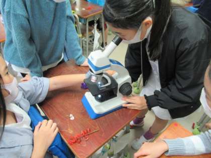 5年生は5時間目の理科の学習で、今まで学習してきた実や種のでき方について振り返りをするとともに、今日は顕微鏡を使って「花粉」を観察する学習に、それぞれの教室で取り組みました。