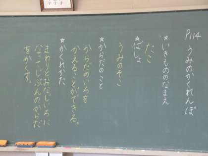 今日から教科書の文章を読んだり挿絵を参考にしたりしながら、海の中の生き物の様子について学ぶ学習に入りました。