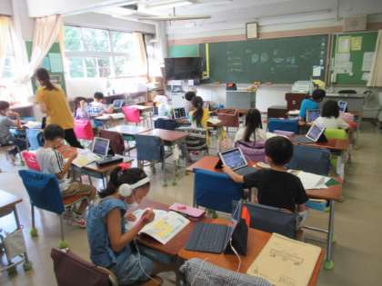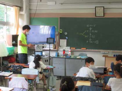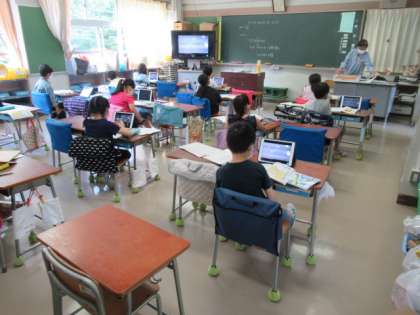 今日の学習のめあては、「たくさん もんだいを とこう。」です。今までに学習してきた事柄を振り返り、かさの単位であるデシリットルやリットルについて、教科書やドリルを使って、まとめの学習に取り組んでいました。1組の担任が3組で授業を行い、オンラインで教室と家庭をつないで進めていました。