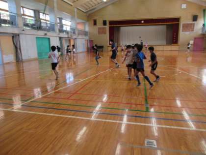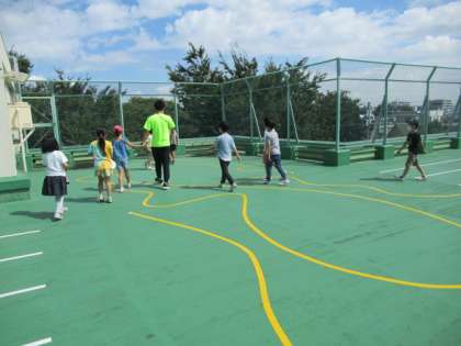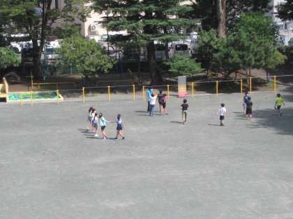 中休みには、校庭・体育館・屋上の割り当ての場所で、子どもたちが先生と一緒に、鬼遊びやボールを使った遊び通して、楽しく過ごしていました。