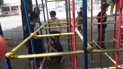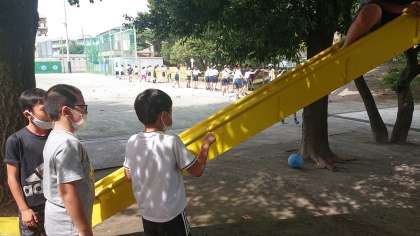 スプーンで ジャングルジムや滑り台、鉄棒などを叩いてみると振動を感じたようで、分かったことを言葉にしている姿が見られました。