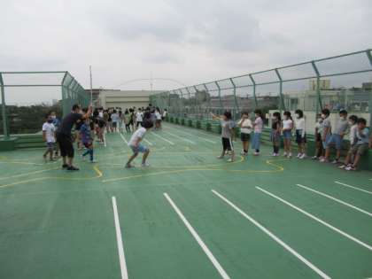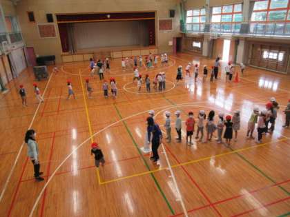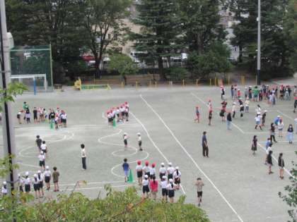 お弁当の時間が終わり、少し休憩を取り、9月の「元気タイム」の活動場所に移動しました。2・3年生は屋上で、1年生は体育館で、4・5・6年生は校庭で、前半は、それぞれの学年・学級での遊びをみんなで楽しみました。