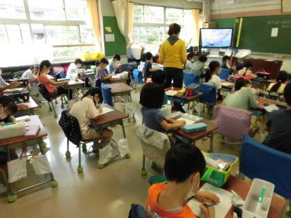 図工の学習では、ロビンソン・クルーソーの話を聞いてから、自分だったらどんな無人島に行きたいかを考えました。どんな場所で?どんな食べ物があって?どんな動物がいるのか?想像がどんどん膨らんできます。形やつけ方を工夫して5色で塗り分けて、自分の島が完成しました。来週は、いよいよ無人島にいろいろなものが増えていきそうです。みんなわくわくしていました。