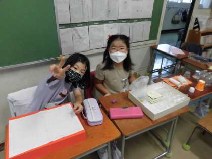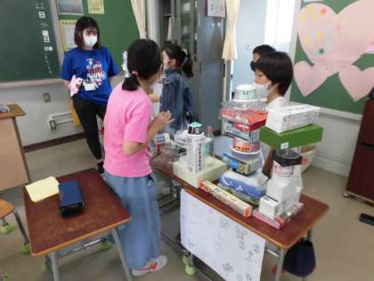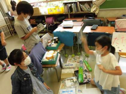 2年生の生活科では、「あそんでためしてくふうして」の学習で、子どもたちの言葉から出た、お店屋さんを行いました。ペットボトル、空き箱、サランラップの芯など集めた材料から、遊びのお店を開きました。店員やお客の立場を経験して、楽しんで学習し取り組んでいました。