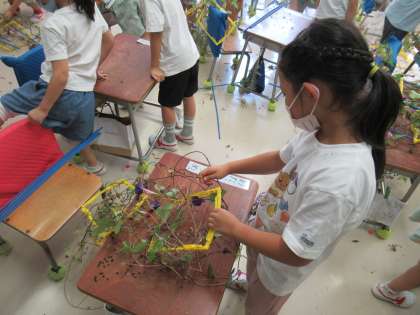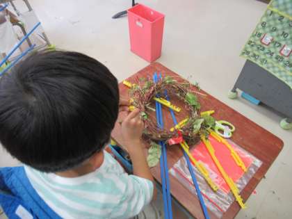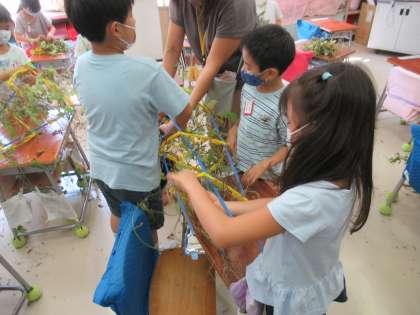 今回は、立派に育ったあさがおのつるを使って、リース作りに挑戦です!容器いっぱいに根が張り、引っこ抜くのも一苦労でした。その後、絡まったつるを上手にほどきながら、形を作りました。「こんなに大きくなったんだね!」「立派なリースができた!」「早く飾りたいな!」わくわくは止まりません。今後、乾燥させた後、クリスマスに向けて飾り付けをしていきます!