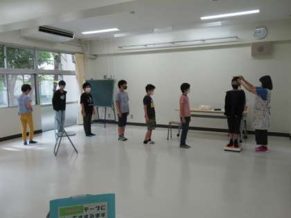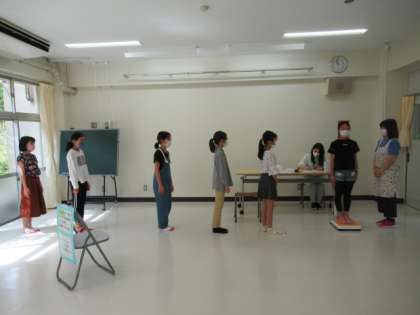 1時間目から4時間目までの時間を学級ごとに割り振り、多目的室で行いました。計測時には、あいさつと自分の名前を伝え、身長と体重を記録していただいています。