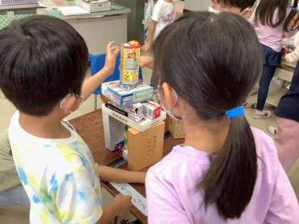 算数では、かたちあそびの学習に入りました。自分が用意した箱を使っていろいろなかたちを作ってみました。車や滑り台を作ってみたり、友達と協力してどれだけ高く積み上げられるかに挑戦したりしました。自分の身長を超える高さまで積み上げられた時はとても嬉しそうで、学級も盛り上がりました。