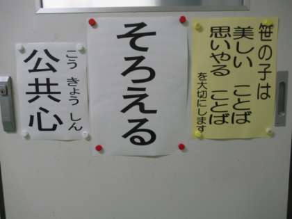 ○今日のキーワードとして「そろえる」をテーマに話をしました。今月の人格の完成を目指してのテーマ「公共心」と関連させて、藤本幸邦さんがつくった「はきものを そろえる」の詩を紹介しました。靴箱で履物をそろえることはもちろん、みんなが使う物や使う場所を考えて、よりよく行動することができるといいですね。