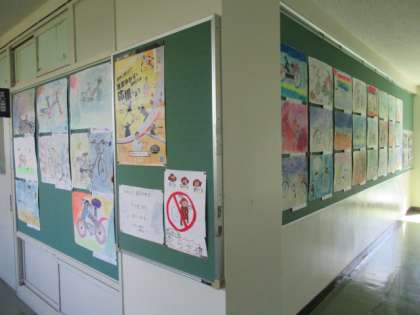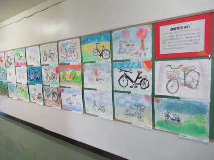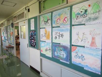 北校舎3階の掲示コーナーでミニ作品展が開かれ、5年生のみなさんが1学期に制作した図工作品「自転車で GO!]の個性豊かな作品が展示されています。