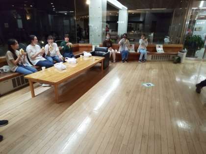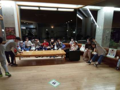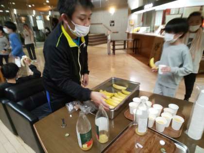 入浴&おみやげタイムを終えた子どもたちは、早めの夕食を補うためのおやつを補給しています。