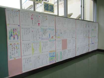 1年生の教室に近い2階渡り廊下の掲示コーナーで発表しています。学校公開でお越しの際、ぜひ、ご覧下さい。