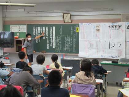 今日の学習のめあては「資料と本文の関係を読み取ろう」です。前の時間に学習したことを確認し、筆者が新たに提示した資料と説明文を結び付けて、その要点を読み取っていました。自分の考えをもとに、友達の考えと交流しながら学びを深めていました。