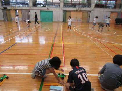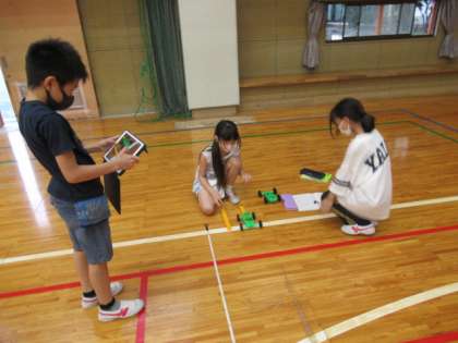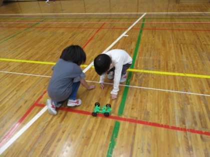 理科「ゴムのはたらき」の学習をしています。「ゴムの伸びの長さをかえると車が走る距離はどうなるのだろうか。」という問題を考えました。自分の予想を立て、実験し、結果から気が付いたことや分かったことを話し合いました。実験が楽しいらしく、グループで協力する姿が見られました。