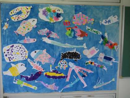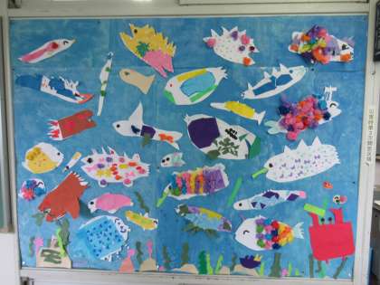 模造紙を青い絵の具で塗って、廊下に海を作りました。できあがった魚を貼り付けると、とても素敵な海ができあがりました!