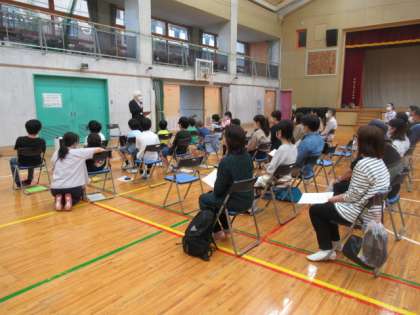親子学習会の第1部では、講師としてご来校いただいた、愛知教育大学教育学部准教授 相羽大輔先生に子どもたち向けのお話をしていただき、保護者の皆様にも一緒に聴いていただきました。相羽先生からは、ご自身の子どもの頃の体験を踏まえ、視覚障害とどのように向き合っていったらよいか、子どもたちとの会話を通してコミュニケーションを図りながら分かりやすくお話してくださいました。子どもたちへの励ましと期待も伝えられ、真剣に聴き入っていました。