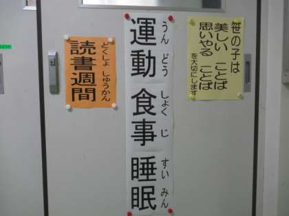 校長からは、○1点目に、先週の「あいさつ週間」で1年生があいさつキッズや標語づくりで活躍し、全校でも気持ちのよいあいさつとみなさんの笑顔がたくさん見られて嬉しかったこと。来月は6年生が2回目の担当となることを伝え、1年生の教室に届くように大きな拍手を全員でしました。 ○2点目に、今週のキーワードとして「運動・食事・睡眠」について示し、4年生が保健学習「体の成長とわたし」で学習していることを紹介し、適度な運動・バランスのよい食事・十分な睡眠の3つについて関心をもち、一人一人が自分の生活をよりよいものにするために考えていきましょう。と伝えました。 ○最後に今日から2週間の取組として始まる2学期の「読書週間」について話しました。図書委員会の発表も参考にし、「読書の秋」を有意義に過ごしましょう。と伝えました。